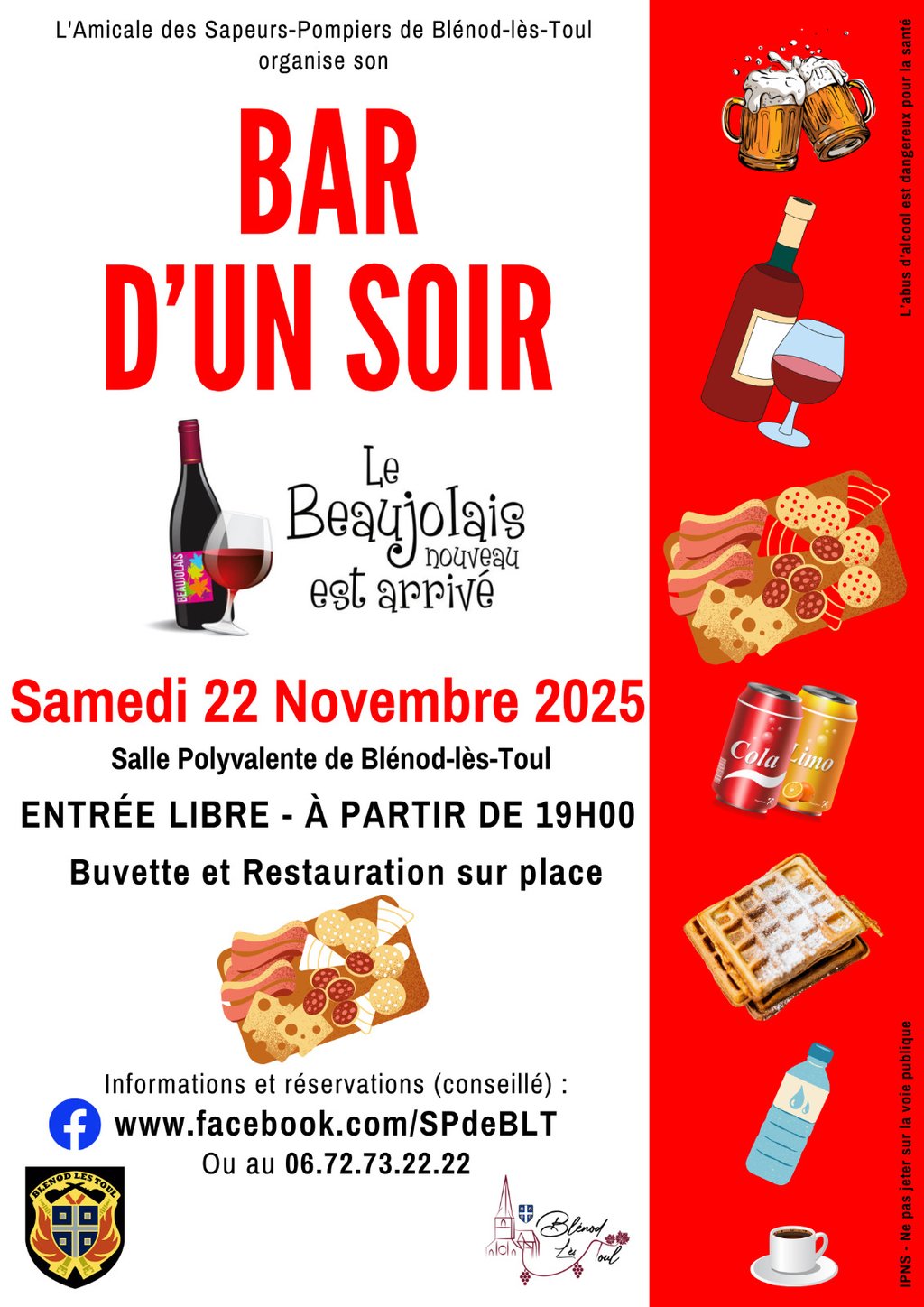L'Amicale des Sapeurs-Pompiers de Blénod-lès-Toul vous invite à célébrer l’arrivée du Beaujolais Nouveau lors d’une soirée conviviale ! Venez profiter d’un bar éphémère pour partager un moment chaleureux et festif avec nous.