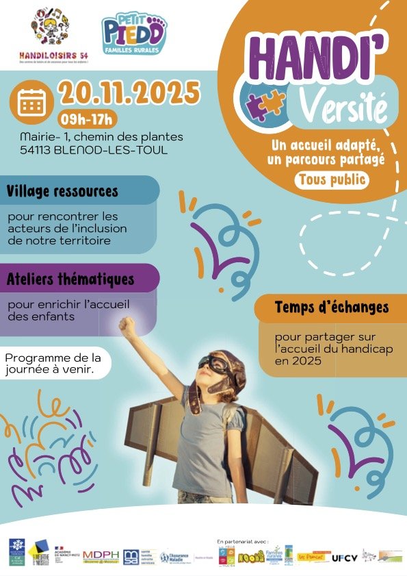 Organisée par le Pôle Ressource Handiloisirs 54, le CTJEP Nooba et la commune de Blénod-lès-Toul, cette journée inédite met à l’honneur la diversité, l’inclusion et le partage d’expériences autour du handicap et de l’enfance.